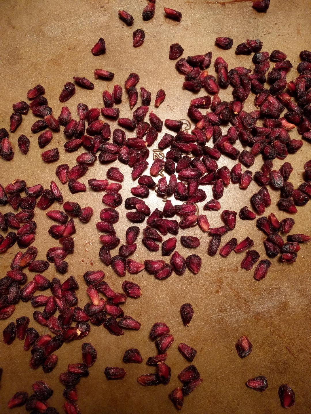 The oven dried pomegranates require you to understand your oven (face palm to forehead). I have an old small oven with a dial starting at “warm” with the next number being 200 degrees. Well I wanted to put the oven on 150 degrees so I put it on warm. That’s gotta be it right; right? Well 6 hours later I realized their’s a line for 150 degrees so I probably had the oven on 100 degrees that whole time. Once I got the correct temperature going, the drying worked a bit better. I made sure to “flip” the pomegranate seeds every 2 hours. And by flip I mean– I attempted to flip the first two times and failed, so the rest of the time I just moved the seeds around with a spatula. Ta da!