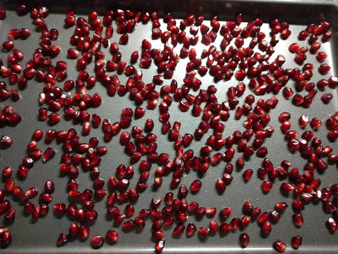 I split my seeds on two different cookie sheets to have one dried at room temperature and one in the oven. Both were evenly spread on the sheets. The room temperature pan is straight forward. Just sit it somewhere safe (and away from Rory), flip the pomegranates every 2 days for an even dry. This process still is not finished and I am on the fifth day.