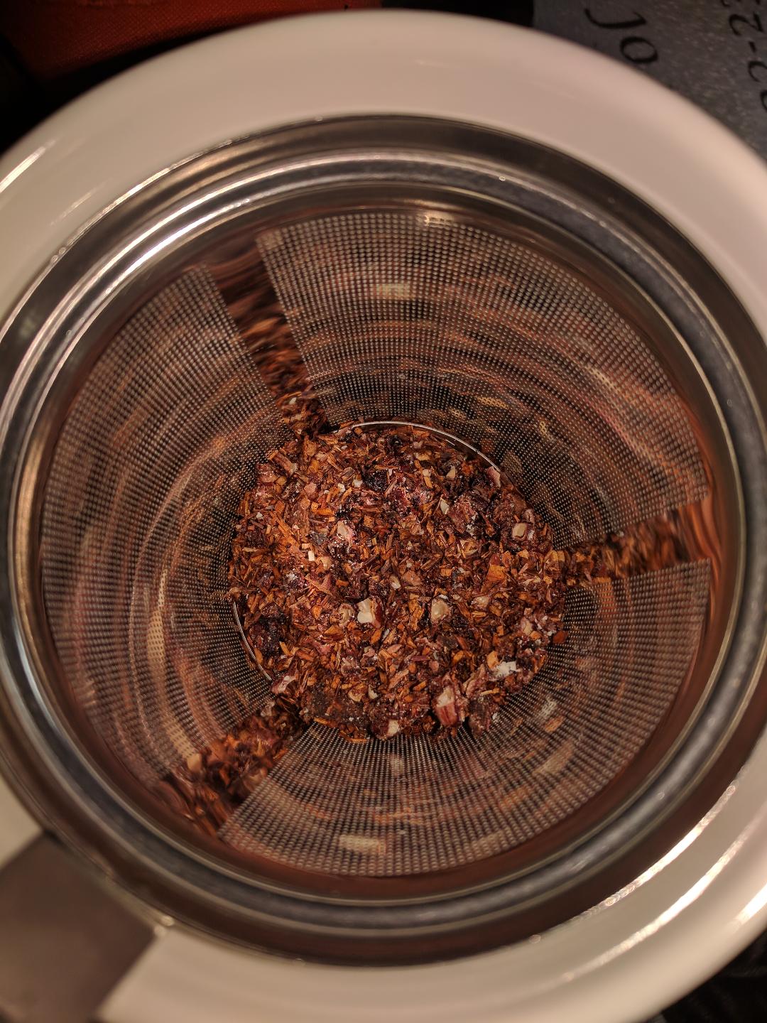 I had my husband try this one and he agreed with me that it’s not too bad. I just need to get the ratios balanced out to have a more flavorful tea. Yesterday a tablespoon of green tea was too much. So tonight I backed it up to 1 1/4 teaspoon of red tea. Still a little much. Don’t worry! I’ll get it! My husband could taste the cloves and suggested I back up on it (I only put 2 whole cloves in!) He could taste the pomegranate but not so much of the cinnamon. He doesn’t like cinnamon so he was okay with that. I LOVE cinnamon so I’ll pile it in next time ~wink~