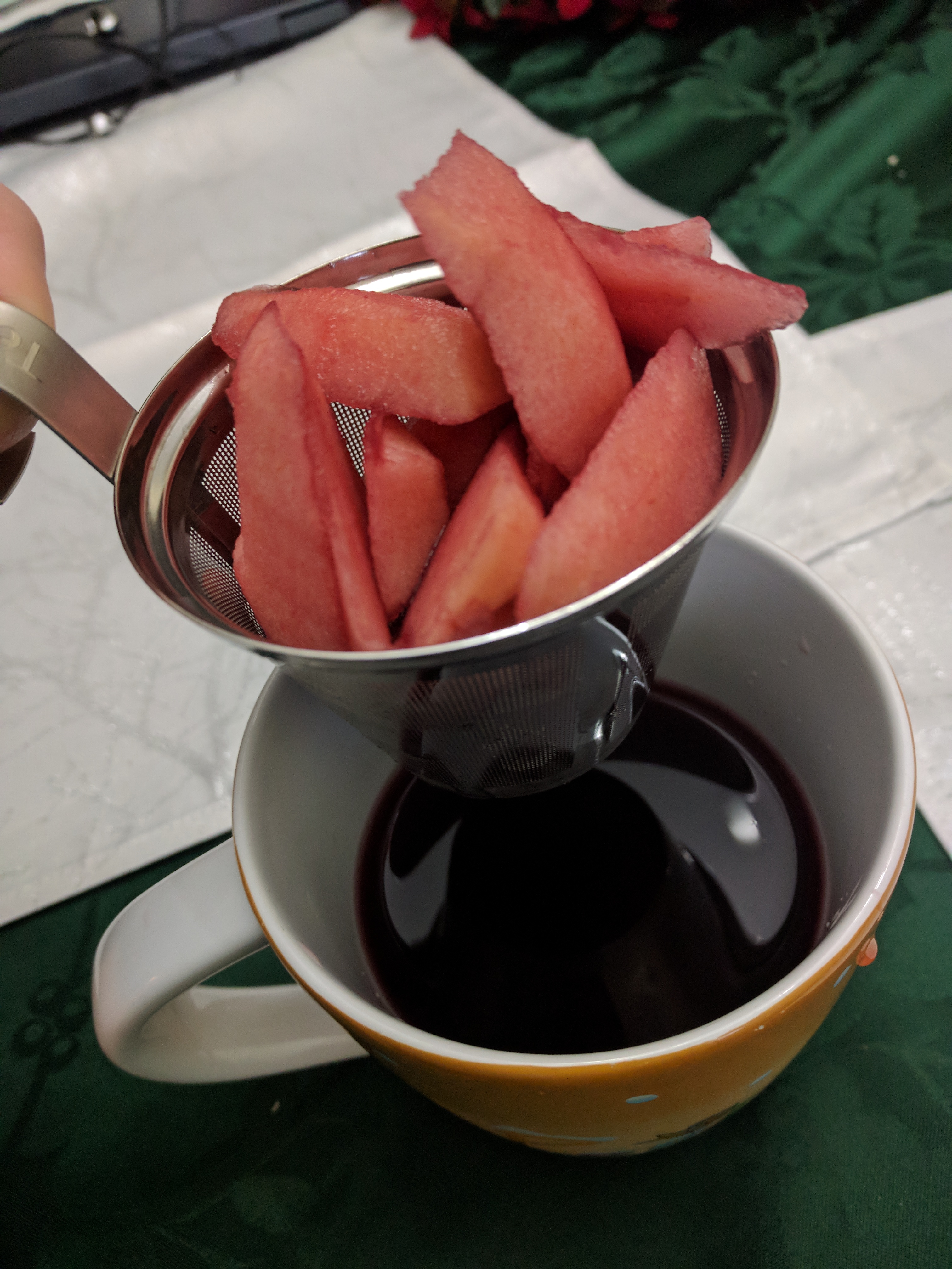 So that is pretty straight forward right? I also tried drying apples infused with Concord Grape Juice. Why? Well my sister declares she hates tea, so some of my experiments are in attempts to change that. She likes apples and grapes. In my mind, I have no clue how to get a grape flavor into a tea. When you dry grapes, they turn into raisins and that really does not sound good to have in a tea. So I’ve attempted infusing apples with grape juice. Here’s how:
