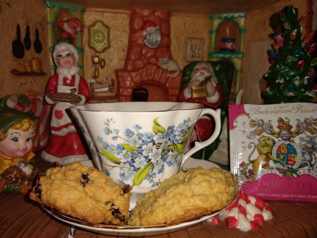 I am not big on pomegranate flavored teas but I read that it pairs well with raisins and it does. I had Buckingham Palace White Tea with Rose and Pomegranate in my Queen Anne teacup. It pairs well, making me realize that teas you don’t like can be made to taste better depending on what you eat with it. Have a great day!
