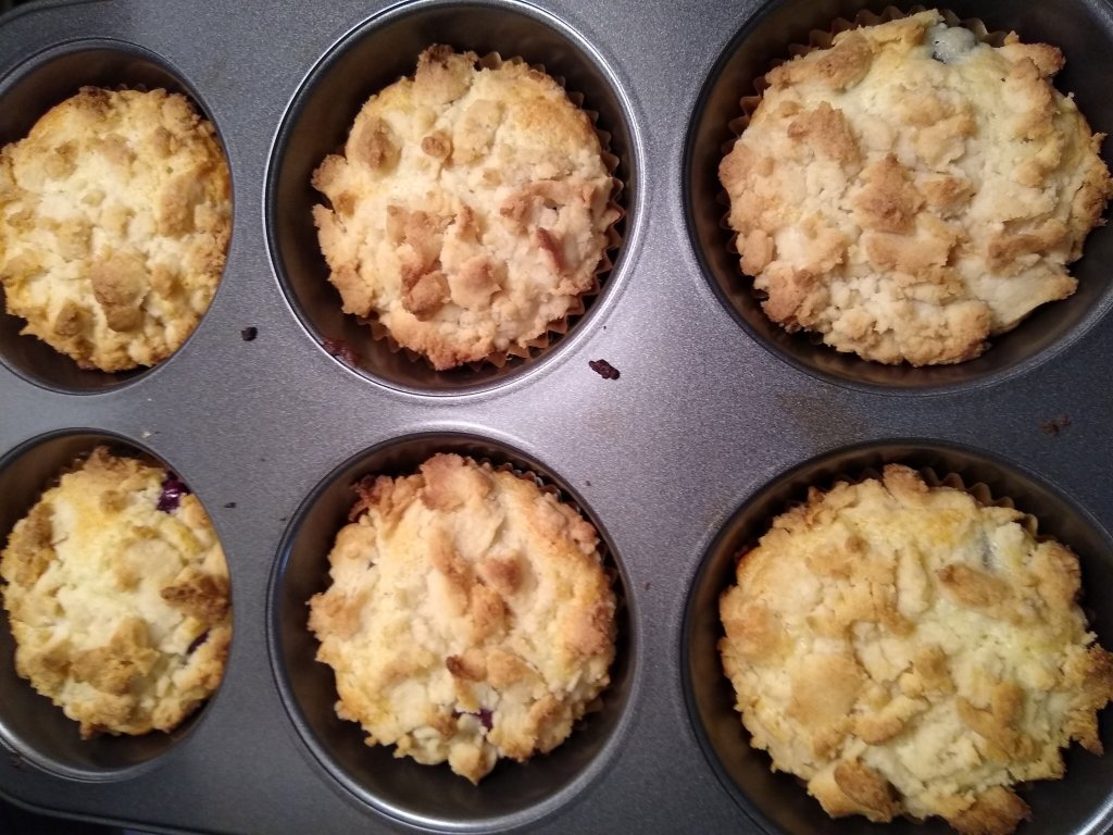 This is the first time I’ve ever made blueberry muffins from scratch. Gotta say, fresh blueberries in the muffins are delicious! There’s several crumble options for the top, but I chose the one with melted butter and brown sugar. My husband is the crumble expert (not really) and he approved, so that’s great news!