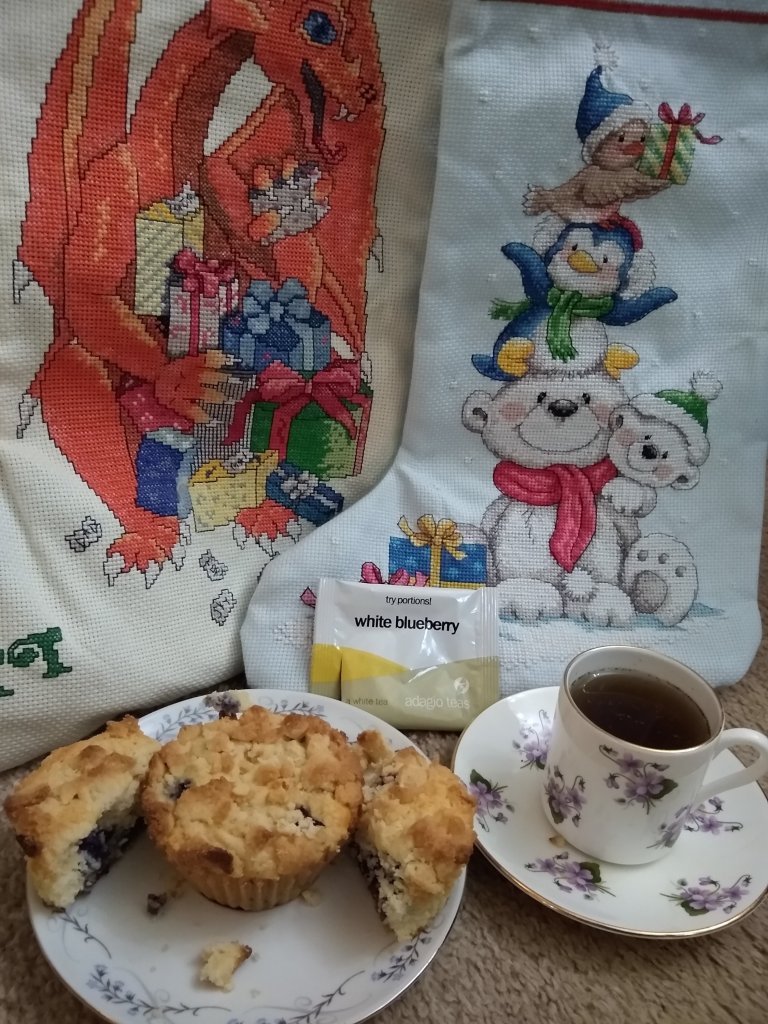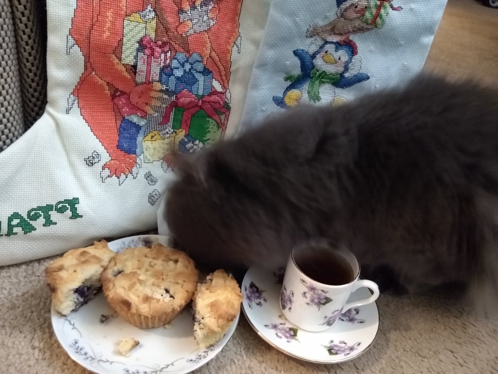 For the first time I drank a blueberry tea I liked. Adagio Tea makes a good White Blueberry tea. I am enjoying it in my Royal Grafton tea set. Aaaand you will see my cat enjoying the muffins in the photo below 🙄