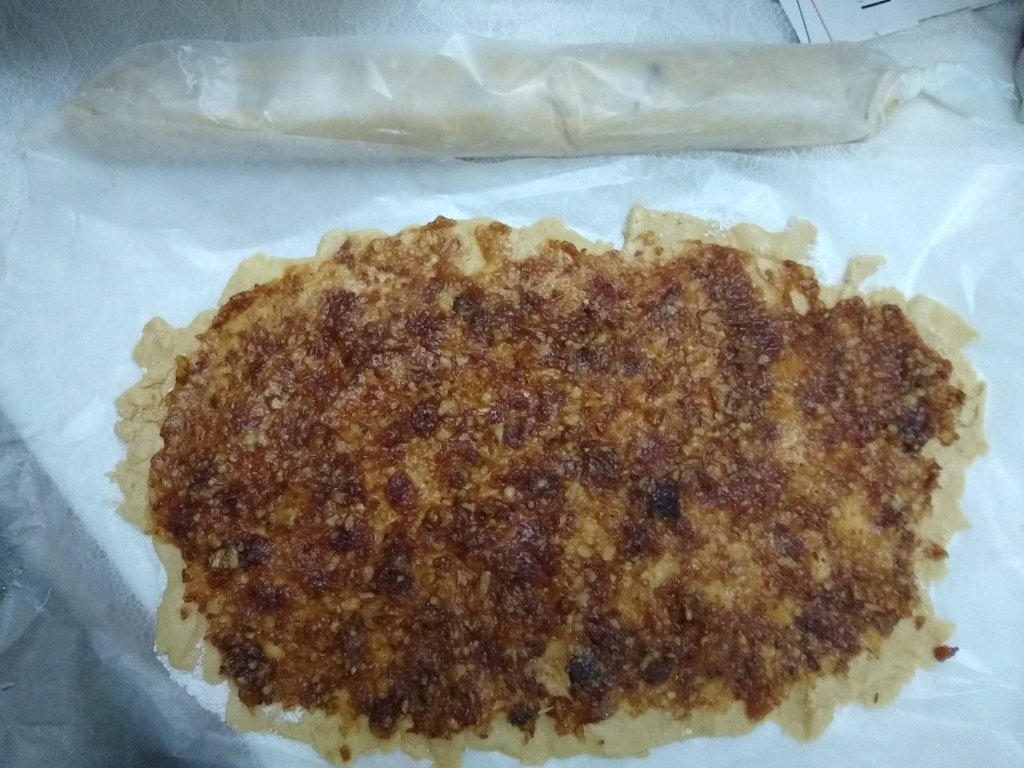 After your Refrigerator Cookie dough is hardened and your Date-Nut filling is made, spread the warm filling onto one hardened dough at a time (as soon as the dough gets warmer the filling is more difficult to spread). Roll dough with filling tightly (hotdog, not hamburger way). Pinch edges to seal. Wrap rolls in waxed paper and chill several hours.