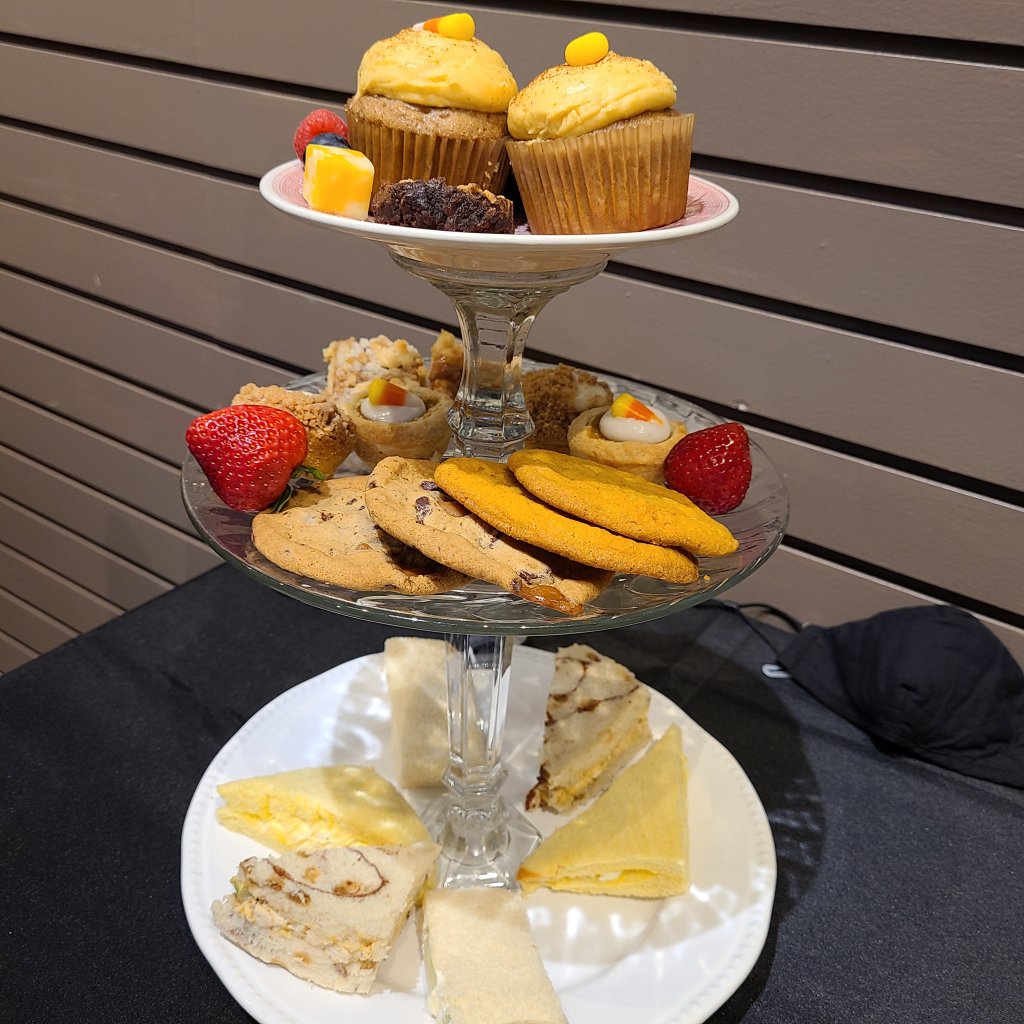 After the tea tasting was done, they brought out the fall themed food. Everything was delicious! I really enjoyed the pumpkin chicken salad with celery sandwich, and literally all the sweets. 5 of the 7 sweets were pumpkin based and they were all great. I was also happy they threw a couple pieces of fruit on there. It helped break up eating so many sweets.