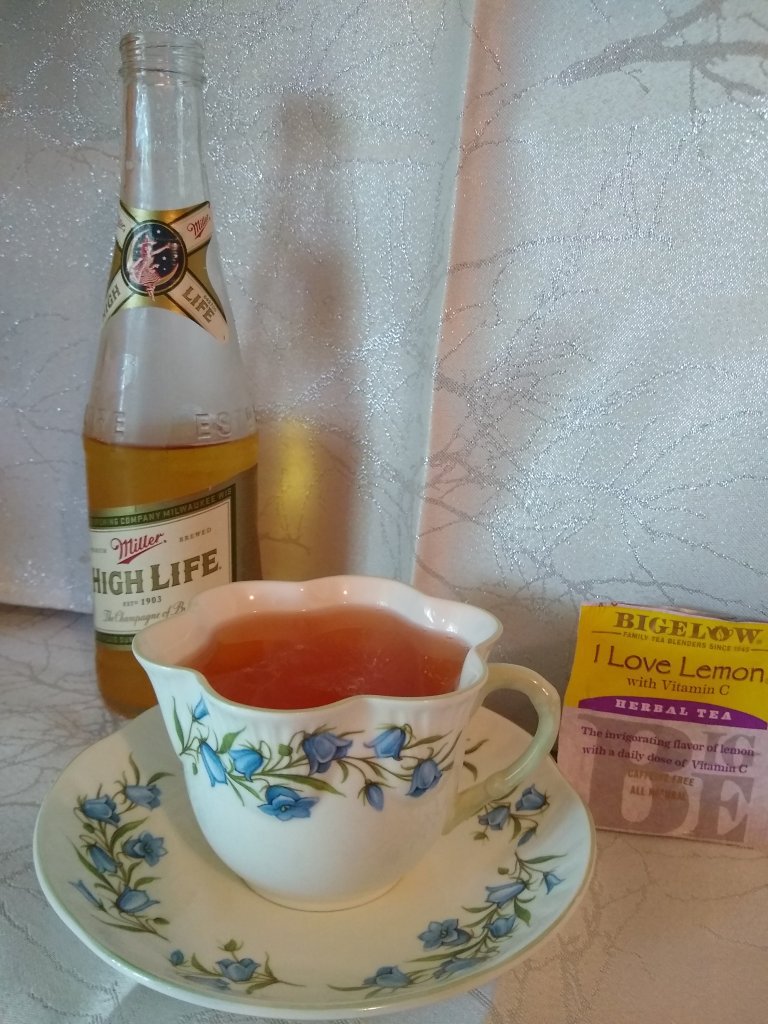 In my Bluebell Staffordshire tea set, I mixed 2 oz of chilled I Love Lemon Bigelow tea with 4 oz of Miller High Life beer. I’ve gotta tell you, this came out great! Even my husband liked it. So if you feel like celebrating a little differently, this is a great choice!