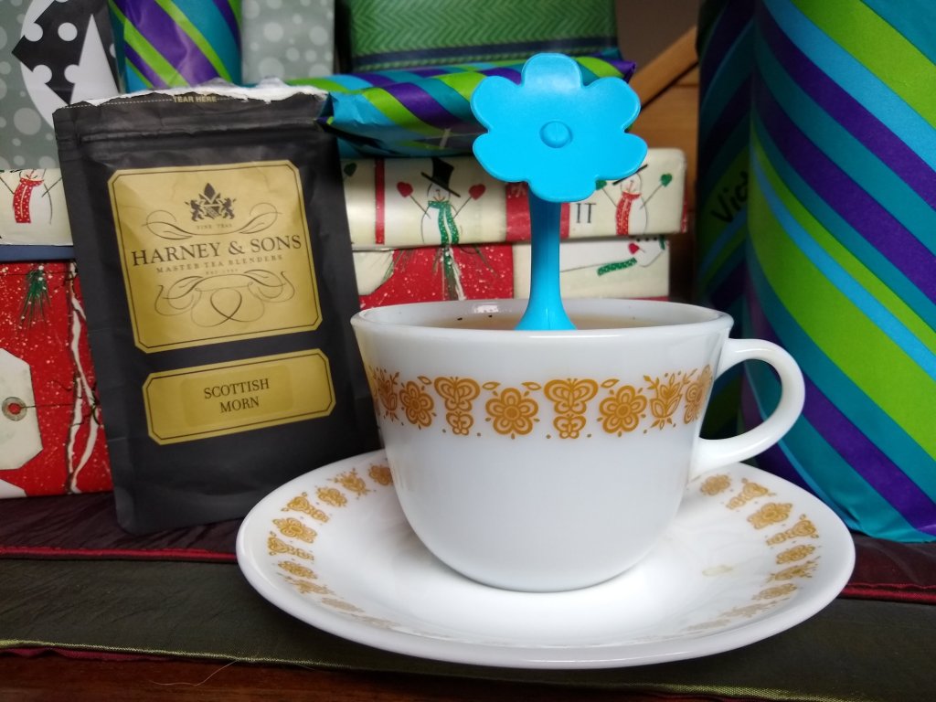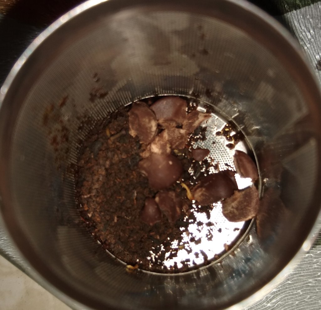 In my tea strainer I mixed 1/8 teaspoon medium roast coffee, 1/4 teaspoon Harney and Sons’ Scottish Morn black tea (any breakfast black tea will work), and chocolate. I tried the chocolate 2 different ways: 1/4 teaspoon powdered (used for hot chocolate) and cut up chocolate chips. The powder was easier to infuse. The chocolate chips required boiling water, but still didn’t completely melt after 3-5 minutes. Either way, both options taste good.
