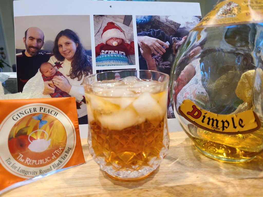I mixed 1.5 oz of Dimple Scotch Whiskey with 6-8 oz of ginger peach tea. The more tea, the better for me. I also enjoyed mixing the hot tea in with iced scotch. Tasting the warm tea with the drink as it was just thrown in ice was a fun sensation.