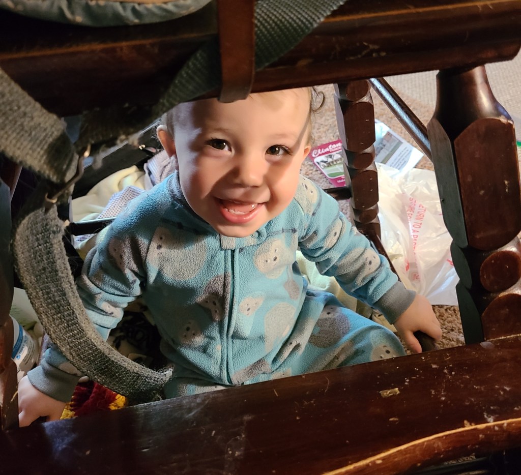 Playing under the high chair at 17 months old. I missed 16 months because of our move into the new house (so much painting!)