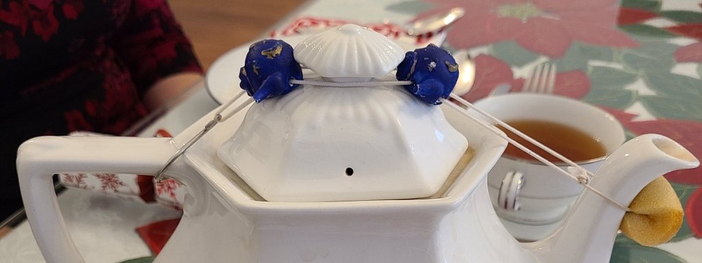 The teapot rig you see in the first photo is a teapot drip catcher. Underneath the spout is a piece of foam that catches all the tea dribbles. When our host pours the tea, she doesn’t have to worry about the extra tea drops that come out in the end.