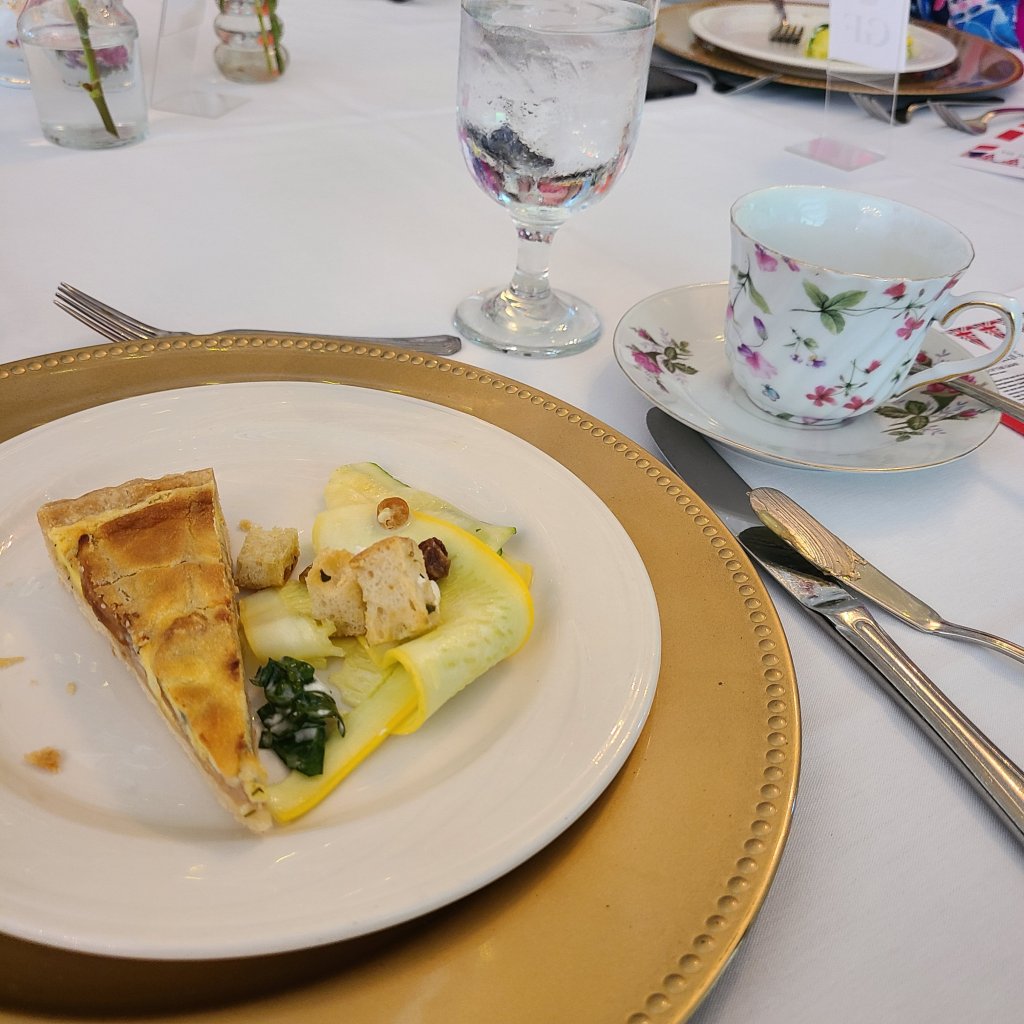 About 30 minutes later our second course arrived. A small portion of Stilton & Pear Quiche served with Ribbon Courgette Salad was paired with Harney & Son’s Victorian London Fog Tea (smooth black teas with bright citrus, sweet vanilla and lavender). I will add that the event was short staffed, so I had to flag down an employee to get our table some tea.