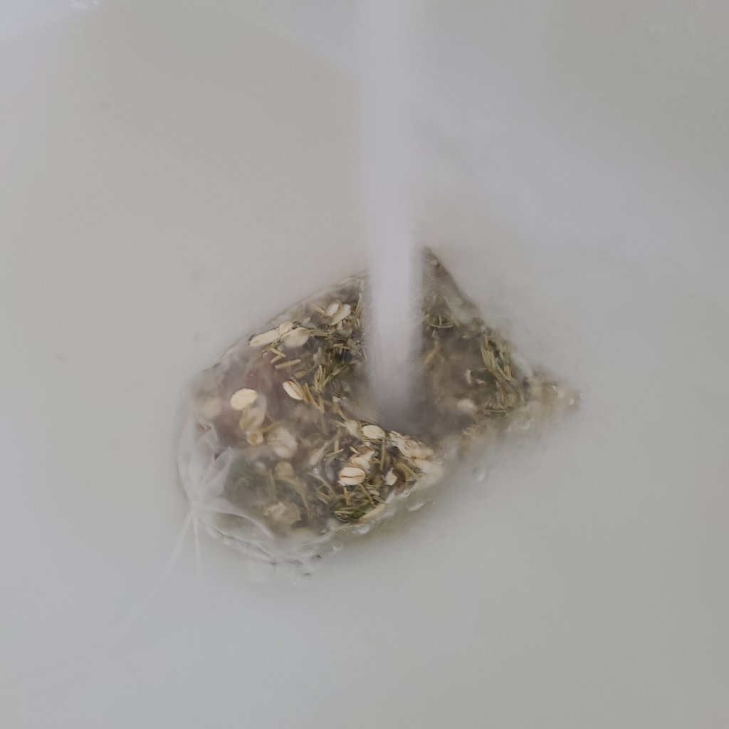 To activate this calming bath tea blend, take it out of the package, place it under running water, and steep it in the bath as long as possible. Will not lie. I got so relaxed at one point I thought a mouse jumped in the bath and climbed on my leg. I took out the bath tea bag after that.