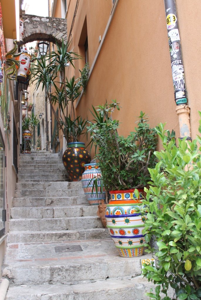 Taormina has charming alleyways. The large Sicilian pots give you an idea of the type of ceramics that can be bought nearby in a store.