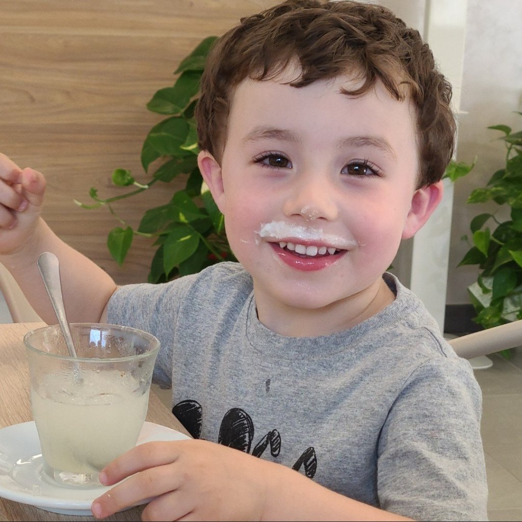 The bambino got a strawberry one with whipped cream on top. His mustache was on point!