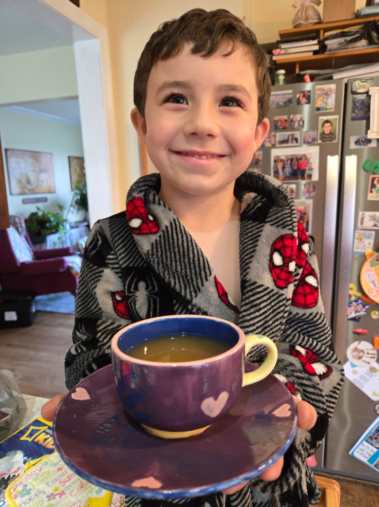 I am sharing a rare low-key morning with my boy, which means we pulled out the cup and saucers that have his 1 year old hand and footprints on it!