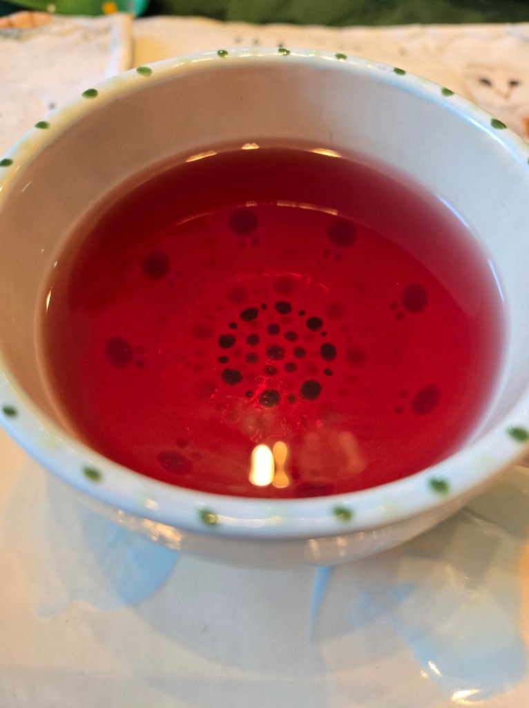 He’s enjoying some apple cider. While I am trying the Republic of Tea’s Pomegranate Green tea, labeled “Superfruit tea”.