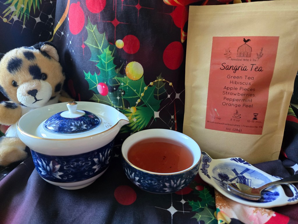 From Friendsville, Pennsylvania is Sangria Tea made at Homestead Herbs & Tea. The owner uses as many home or locally grown herbs as possible and blends them into teas. Being a big fan of this, I chose the Sangria Tea with green tea, hibiscus, apple pieces, strawberries, peppermint, and orange peel. This can best be described as fruity and refreshing.